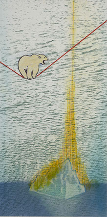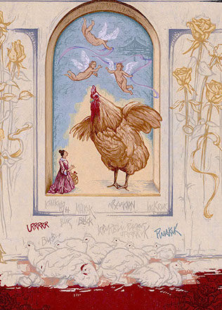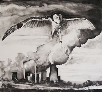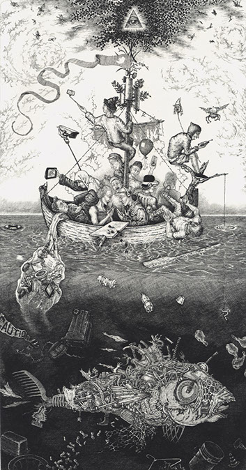 Over the last few years, my prints and related drawings have focused on issues surrounding animal abuse, the environment, and the decline of the natural world as I once knew it. The Adored and Aggrieved pairs the image of a “Praiseworthy Chicken” as conceived in ancient religions and cultures, with a huddled flock of “industrial chickens,” demeaned and awaiting an unsavory fate. If it was once thought of as a symbol of wisdom, courage and maternal love, today the chicken has largely lost its lofty place in our imagination as well as its ability to live its life and express itself naturally in the everyday world. The differences and inequities seen in this print between the revered bird and its lumpen, maltreated cousins could also echo our own divided class and social structures.