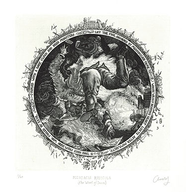 I am happy to report that my fourth and final etching from the series based on the sixteenth century engraver Hendrick Goltzius’ The Four Disgracers is complete. Titled Mendacia Ridicula (The Wheel of Ixion), it is derived from the most detailed and complex of Goltzius’ four engravings which, in turn, were based on paintings by the Dutch artist Cornelis van Haarlem. Updated to reflect current curses of humanity, this image in particular will delight, edify, or offend, depending. And to those who demand more civility in public discourse while cravenly enabling insanity, I can only reply, “Mendacia Ridicula!”
