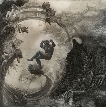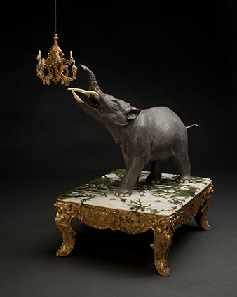The picturesque aesthetic of the eighteenth century refers to a time when our relationship to nature was being expanded by scientific discoveries, yet separated by the disappearance of wild places. In Passé Doré, as in every scene that I create, is a fantasy inspiring curiosity about the unknown animal, while nourishing the imagination of the viewer with intricate details. Mysterious giants wander through palatial ruins, discovering the overgrown remains of monuments to human greatness. Moss and vines cover the fossils of civilization, and show the effects of time in their decay.