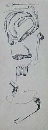The ongoing Hallucination Series of collages reference and sometimes directly quote from a suite of drawings done over a three month period in Madrid, Spain. The curvilinear and convoluted forms of the drawings emphasize and enhance their dreamlike quality. A Spanish friend, Luis Rangel, began referring to them as hallucinations, which increasingly seemed to be an apt description and title.