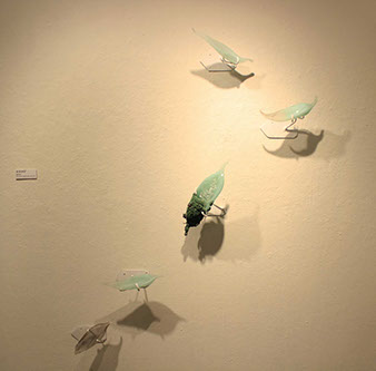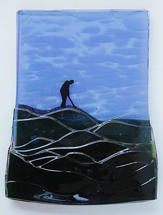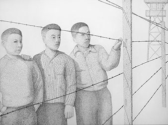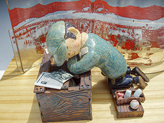 Americans during WWII. As internees were released, they packed the few items they brought and the “new” items they crafted in camp. The tired boy is resting on the family crate, and dreaming of going home. The tall glass background shows the loading of crates onto trucks, and mountains that surrounded the camp. The shorter glass background represents the outside hostile environments that the internees will face once they leave the camp.