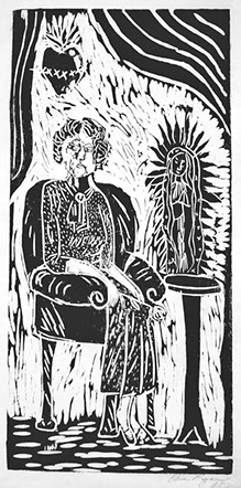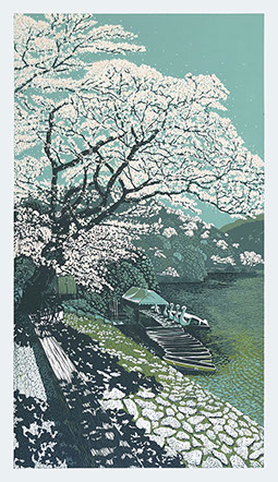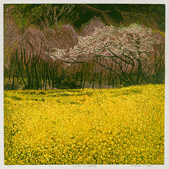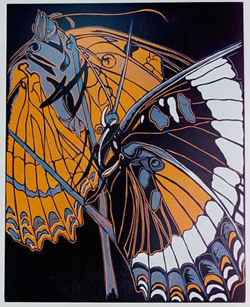My principal medium is color woodcut –hand-printed from a single block using a reductive process and multiple acetate stencils.