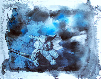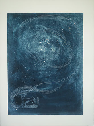 Much of my recent work has included shades of blue and fields of stars. I’m particularly interested in the human activity of grouping stars into pictorial representations of constellations. Anyone who has spent time under very dark skies, overwhelmed by the vast number of visible points of light, might wonder not only how earlier civilizations found patterns among the seeming randomness appearing above them, but also how they shaped these patterns into animals and creatures they were familiar with in the visible daytime world. In the West, the constellations we know may have originated with the ancient Babylonians, but civilizations in Asia and the Southern hemisphere likewise saw patterns in the starscape above them. I believe this consideration is as important to our understanding of ancient art-making, of ancient image creation, such as the earliest cave paintings. Dream a Little Dream features a sleeping girl beneath a field of stars which she herself dreams into existence. With the exception of the best-known portion of Ursa major, the stars represented here do not correlate with the actual night sky, underscoring the dreaming figure’s creation of her own night sky, as well as my own.
