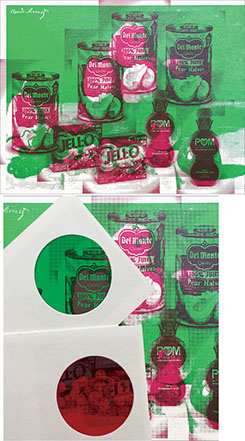 We were watching The Impressionists: Painting and Revolution, a four-part series chronicling various impressionist artists, painting techniques and their lives. The narrator described the Impressionists as revolutionaries who saw the world in a new way. While the Impressionists were revolutionaries, they portrayed, not saw, the world in a new way. The thought of seeing the world in a new way led to the Seeing Red series, pieces that are created with the intent of being viewed through a filter, allowing you to deconstruct or focus on different parts of the finished piece. Industrial Impressionism combines a classic impressionist still life and a contemporary assemblage of related consumer products. This is an edition that is presented in various color combinations.
