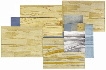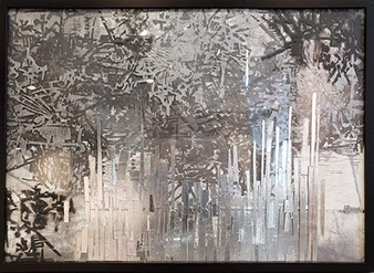 I am interested in the patterns of nature. This monoprint collage is a study of the geological layers that exist in the landscape. The layers are frozen in time, recording the history of a particular place. My eyes are cameras with lenses both microscopic and wide-angled. I record the landscape observant of these opposites. When viewed from a distance, the composition could be seen as a larger landscape, but when inspected closely, the textures and individual layers have more character. This monoprint measures the differences in the landscape, using the horizontal striations balanced by the printed line as a datum.